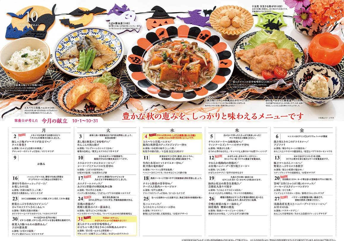 2017-09-29 10月のお弁当の献立を先行配信です!栄養士が考え、お弁当で秋を感じていただける献立となっております。秋の味覚をしっかりと味わえるお弁当になっております。ぜひご覧いただきご賞味ください。 ※画像をクリックすると拡大していただけます。 Tweet