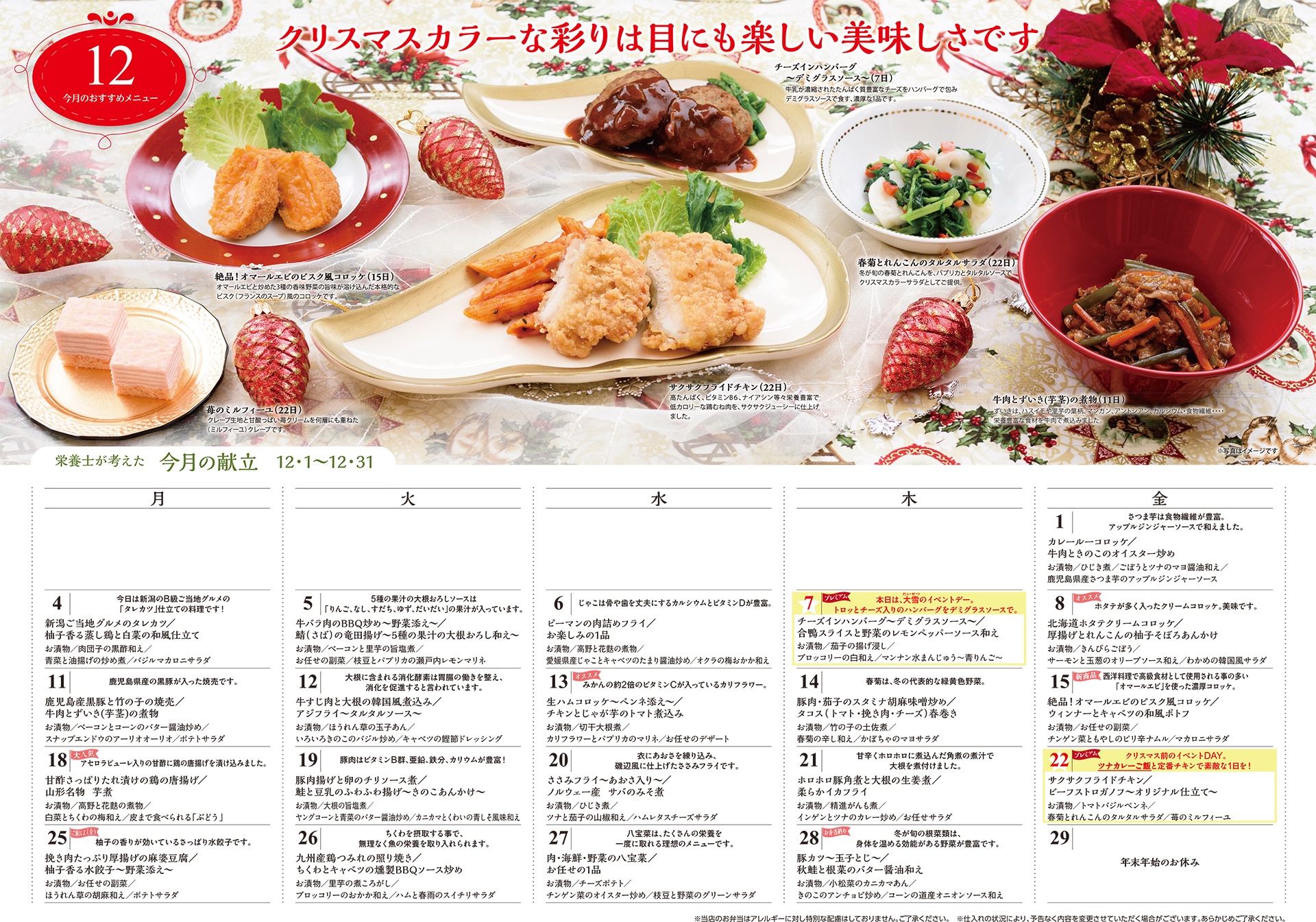 2017-11-13 12月のお弁当の献立を先行配信です!栄養士が考え、今月は色鮮やかな商品揃いとなっております。普段よりもちょっぴり贅沢に!でも栄養は偏らないようなお弁当が揃っています!ぜひご覧いただきご賞味ください。 ※画像をクリックすると拡大していただけます。 Tweet