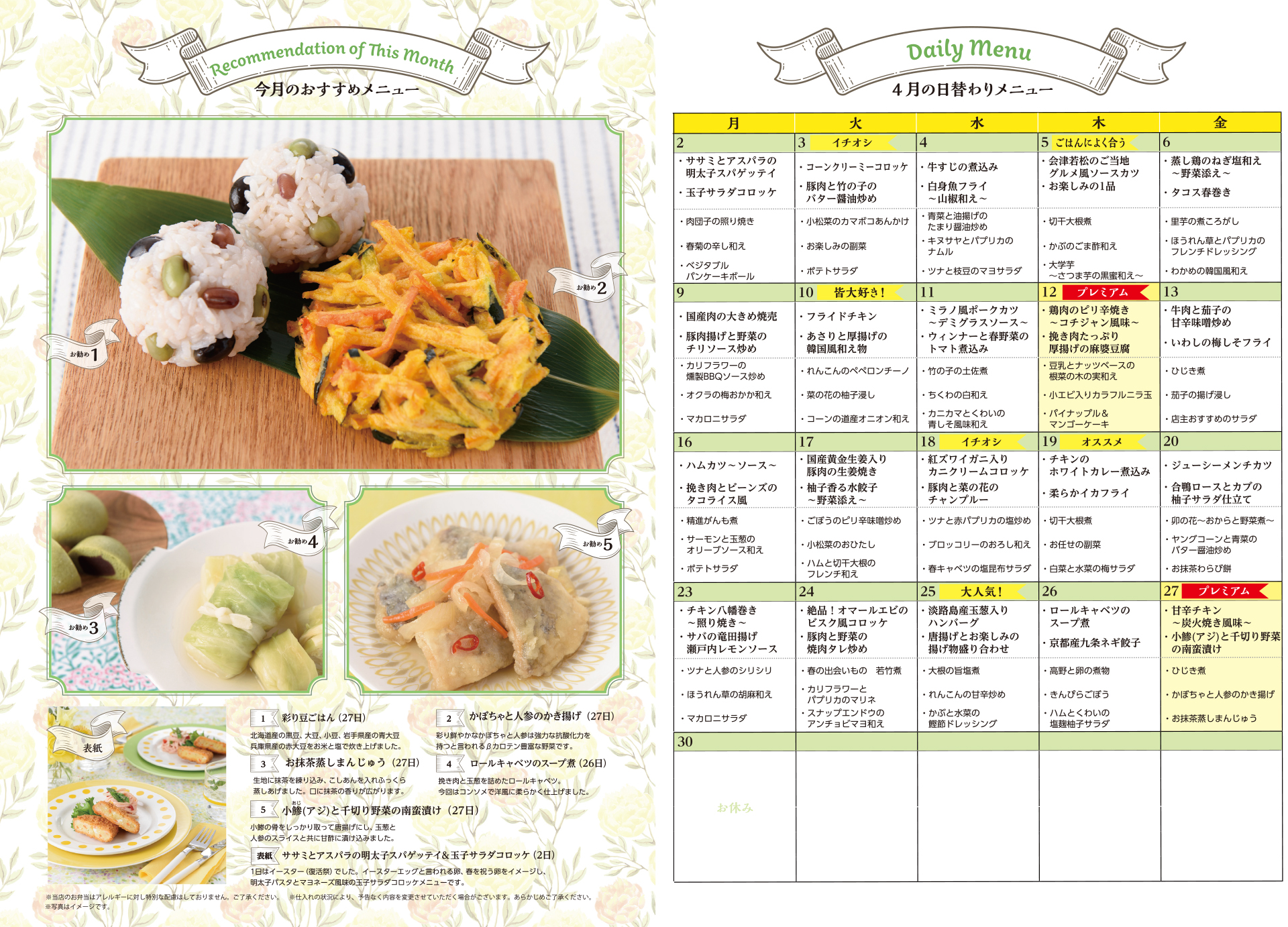 2018-03-16 2018年4月のお弁当の献立を先行配信です!栄養士が考え、今月は春の風吹く新たなメニューが登場。おいしく健康に。ぜひご覧いただきご賞味ください。 ※画像をクリックすると拡大していただけます。 Tweet