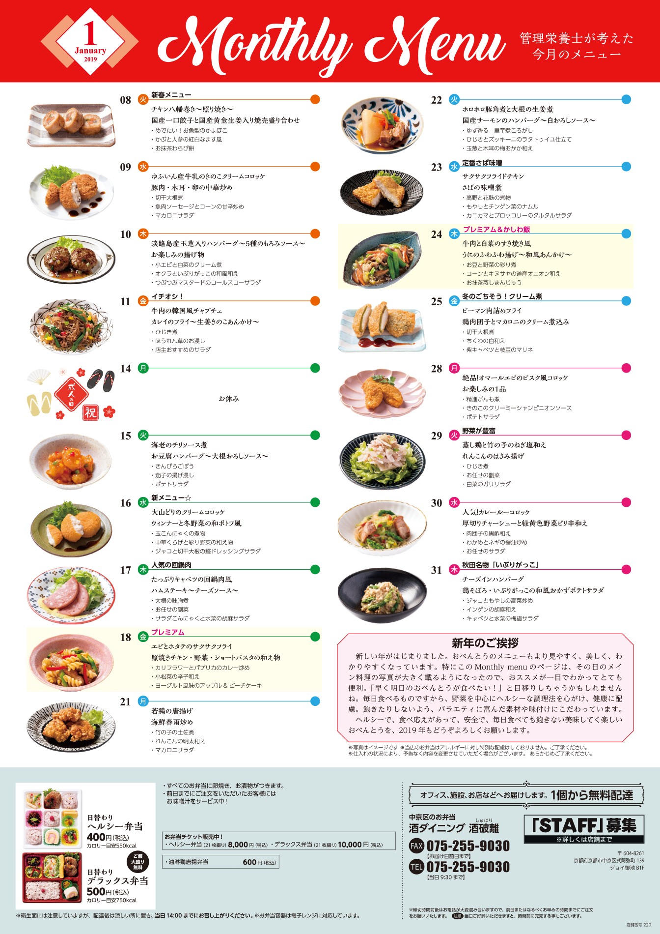 2019-01-02 2019年1月のお弁当の献立を配信!栄養士が考えた献立です!1月のお弁当はメニューを刷新し、気持ちよく新年を迎えられるお弁当です!おいしいものを健康的に!ぜひご覧いただきご賞味ください。 ※画像をクリックすると拡大していただけます。 Tweet