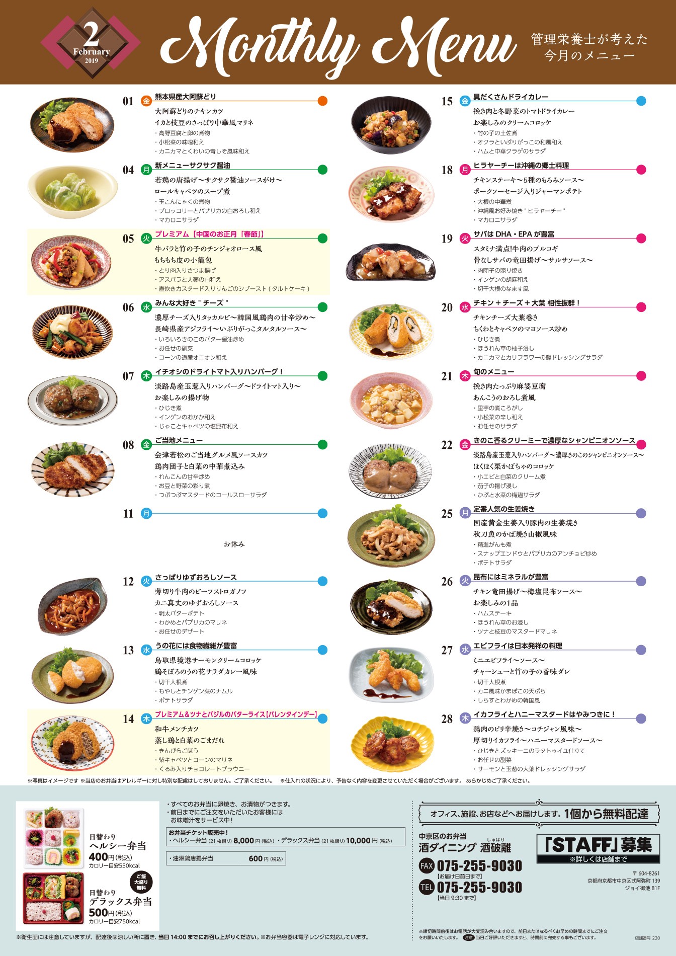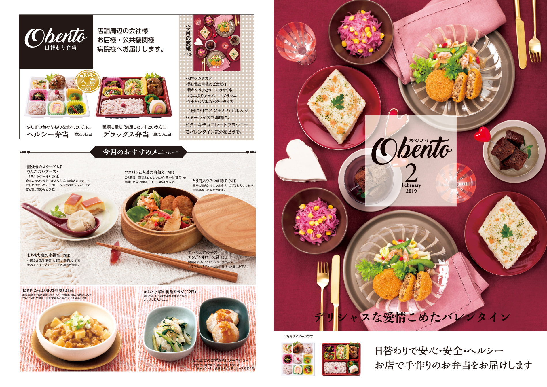 2019-01-19 2019年2月のお弁当の献立を配信!栄養士が考えた献立です!2月のお弁当はバレンタインもありかわいいお弁当が盛りだくさん!おいしいものを健康的に!ぜひご覧いただきご賞味ください。 ※画像をクリックすると拡大していただけます。 Tweet